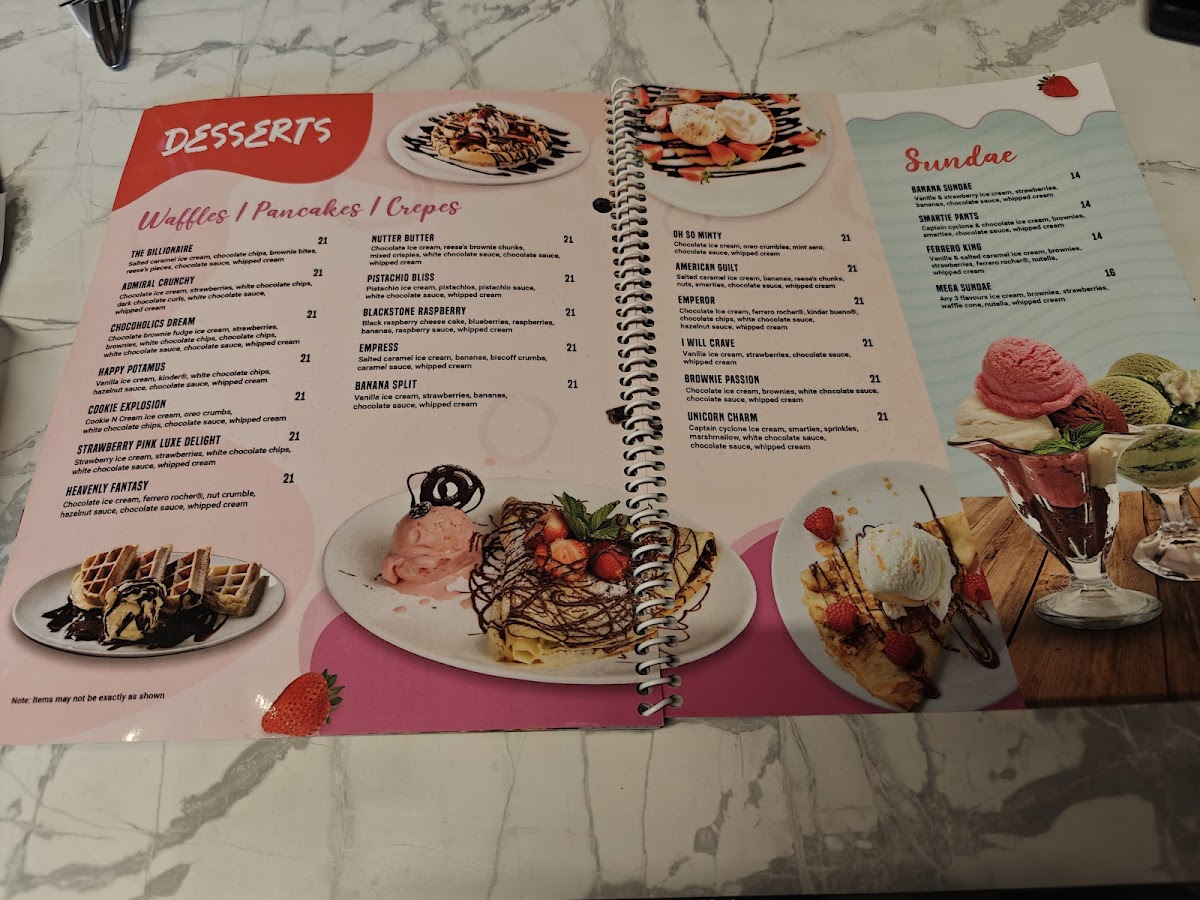 This place is so well designed, super classy interior! As for the food, you can't go wrong with their desserts. They've got pancakes, waffles, crepes, and many other favorite dessert items which you can't top with all kinds of different flavors. We tried the Pink Delight & Cream pancakes and the super chocolatey Heavenly Fantasy Waffle. Huge servings, loaded with toppings and great flavors. From their savory menu we tried the Spicy Chicken Pizza, which was quite decent too. Shout out to our server Jay who guided us through the menu patiently to pick the best items for our palate